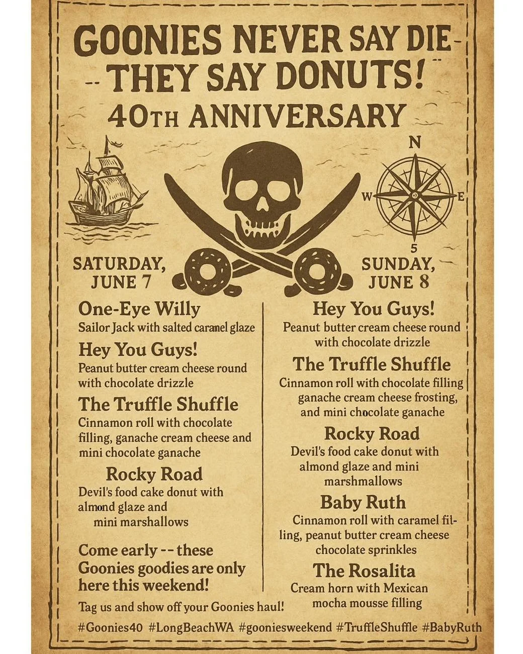 Goonies never say die - They say DONUTS! Themed donut flavors on Sat-Sun.