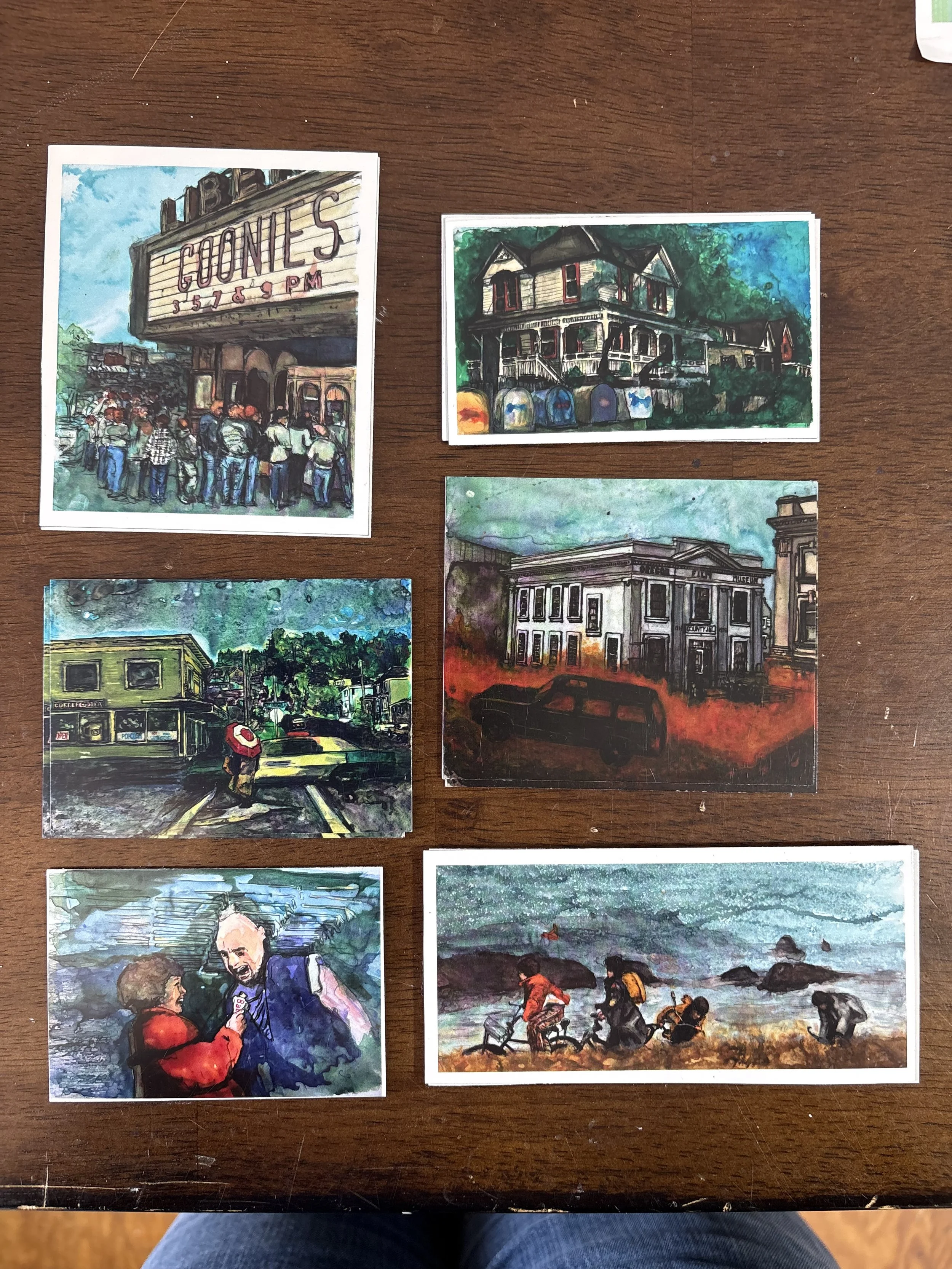 Limited edition Goonies magnets and postcards featuring the art of Missy StRain. Missy StRain’s original paintings of picturesque landscapes include iconic scenes from locally produced films, bars and intersections in Astoria. Her images from the Goonies evoke memories of beloved scenes from the movie.